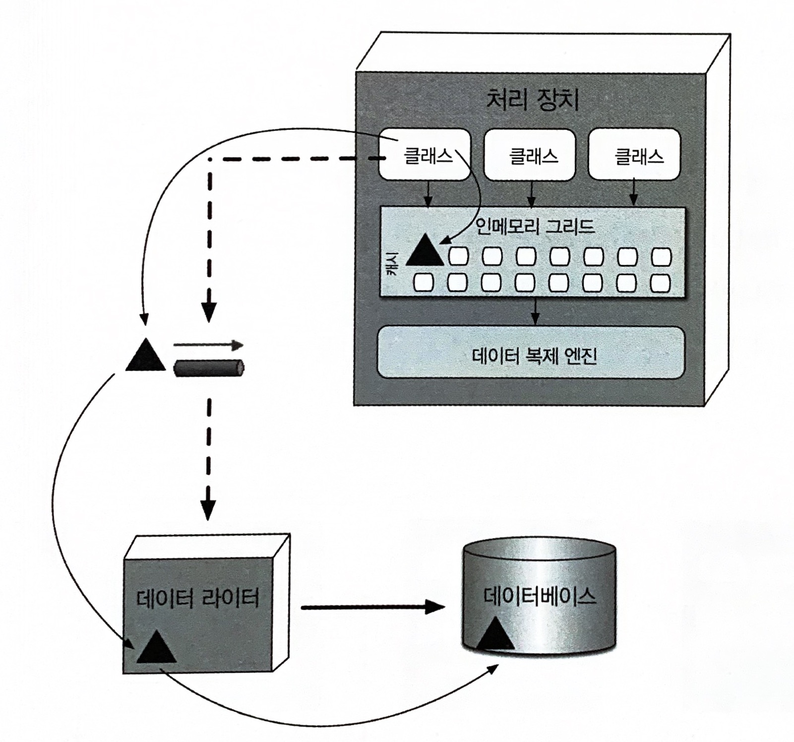 데이터 그리드(data grid)는 이 아키텍처 스타일에서 중요하고 필수적인 컴포넌트이다. 요즘은 데이터 그리드가 거의 대부분 복제 캐시로서 처리 장치에만 구현되어 있지만, 외부 컨트롤러가 필요한 복제 캐시 구현체나 분산 캐시를 사용할 경우, 데이터 그리드는 가상 미들웨어 내부의 데이터 그리드 컴포넌트와 처리 장치 모두에 위치한다. 아래 그림은 처리 장치 간 동기식 데이터 복제 흐름을 나타낸 것이다. 실제로 데이터 동기화는 비동기 방식으로 매우 신속하게, 대개 100밀리초 미만으로 이루어진다.