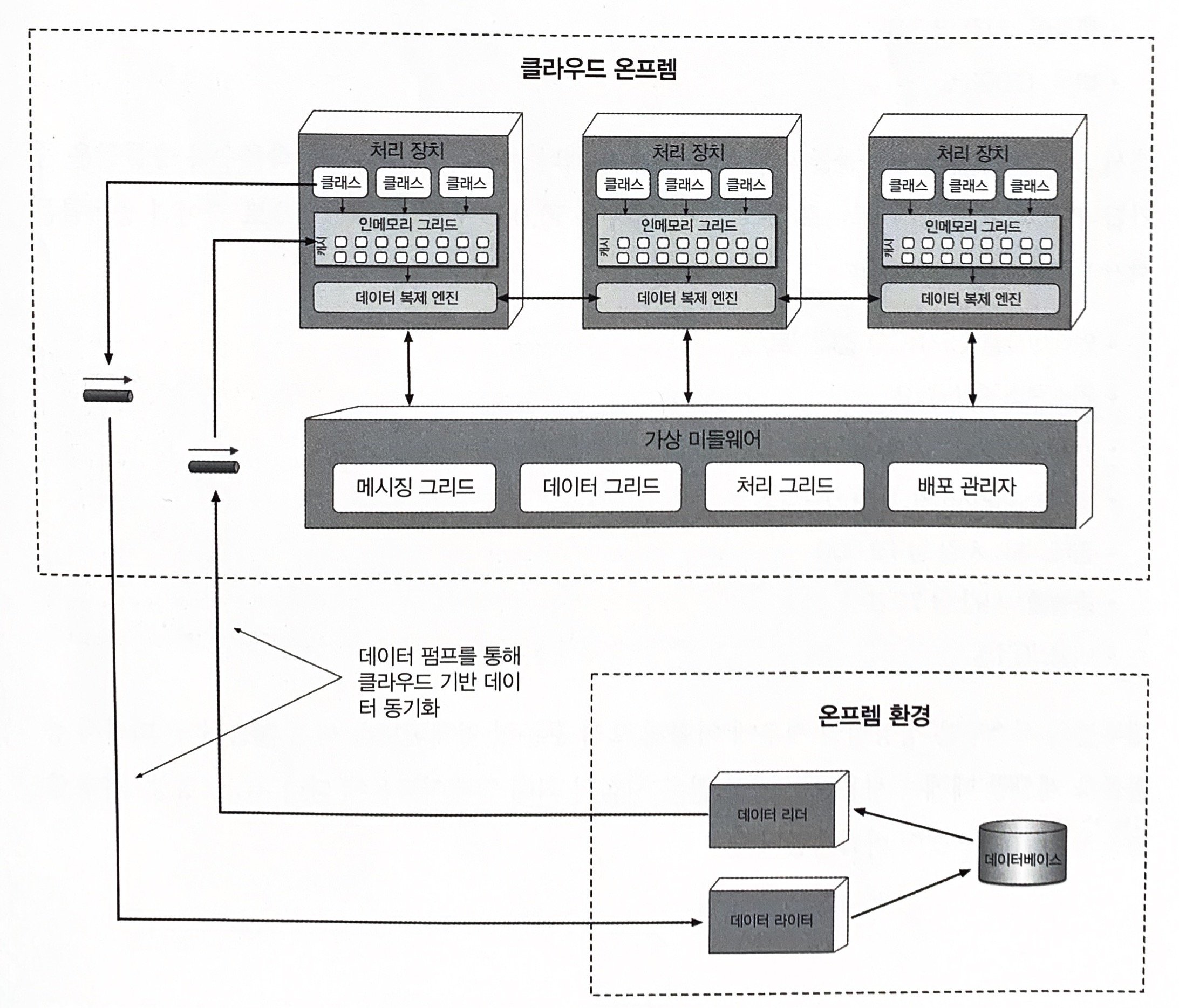 물리 데이터베이스와 데이터를 온프레미스에 그대로 둔 상태로, 클라우드 기반의 매니지 환경에서 처리 장치와 가상 미들웨어를 통해 애플리케이션을 배포하는 하이브리드 클라우드가 가능하다는 것이 공간 기반 아키텍처의 장점이다.