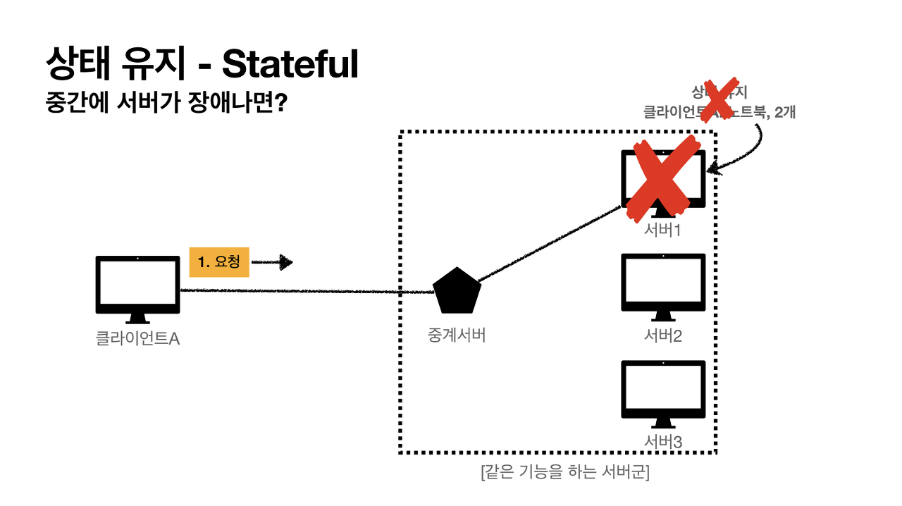 서버가 클라이언트의 상태를 보존한다. 클라이언트가 상품을 구입할 때 상품 정보와 결제 정보를 매칭된 서버로 계속 유지해야 되서 서버를 늘릴 수가 없다. 중간에 유지해야할 서버가 장애가 발생하면 다른 서버로 바뀌게 되면 클라이언트가 다시 정보를 요청을 해야 된다.