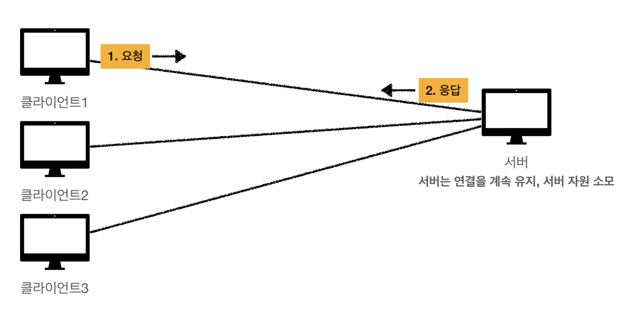 여러 클라이언트에서 서버로 응답을 요청하면 서버는 요청이 들어온 클라이언트 마다 연결을 유지해서 상태를 저장한다. 클라이언트가 많아 질수록 연결을 유지하는 서버의 자원이 계속 소모되는 단점이 있다.