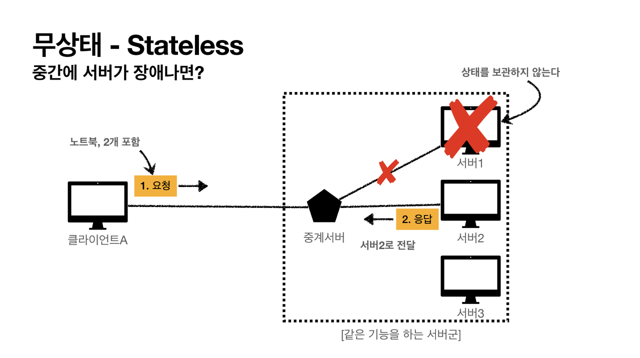 서버가 클라이언트의 상태를 보존하지 않는다. 클라이언트가 상품을 구입할 때 애초에 필요한 상품 정보와 결제 정보를 담아서 요청을 하면 서버에서는 상태를 보존하지 않고 응답만 한다. 중간에 서버가 장애가 발생해도 클라이언트가 필요한 정보들을 이미 담아 있어서 다른 서버에 요청 할 수 있다.