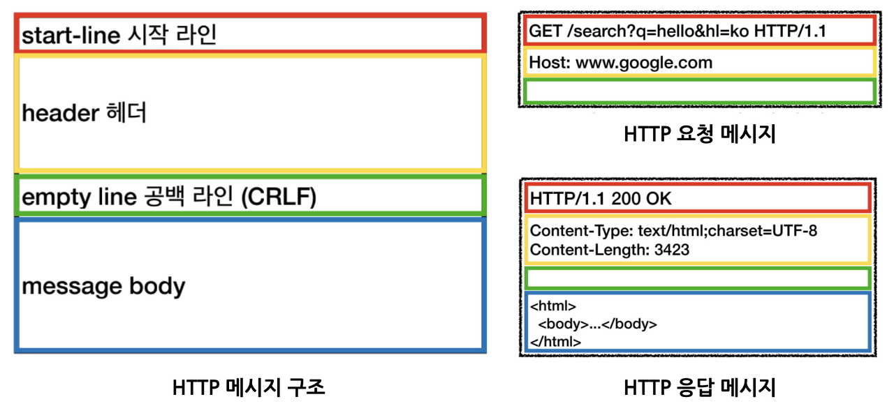 HTTP 메시지 구조에서 start-line, header, empty line(CRLF), message body로 4가지 구조로 나눈다.