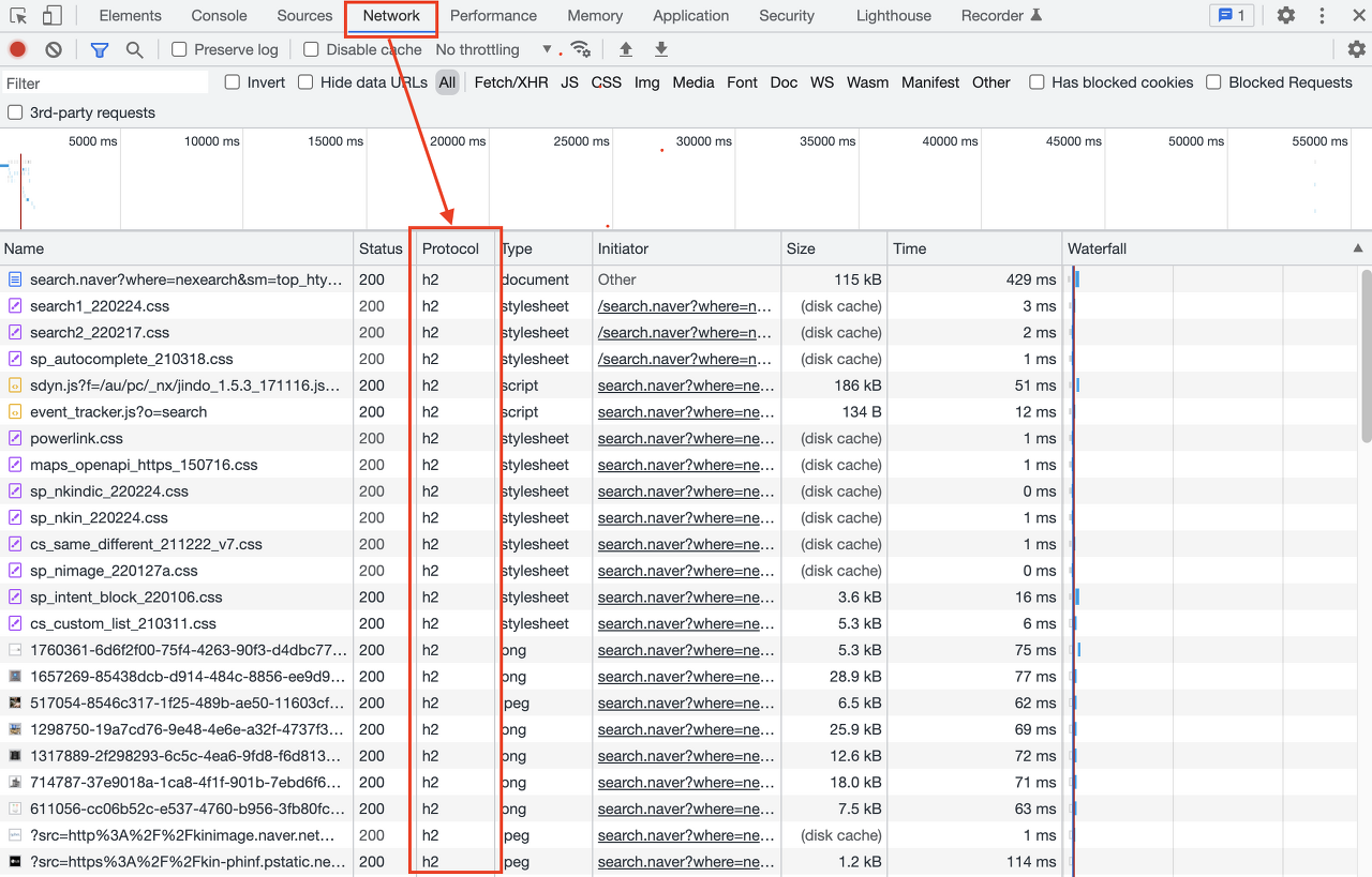 개발자 도구에서 Network 탭의 Protocol에서 어떤 버전의 HTTP를 사용하는지 알 수 있다.