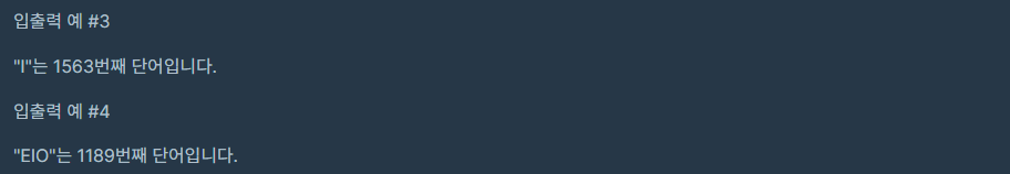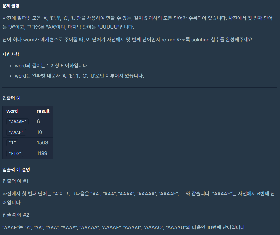 https://school.programmers.co.kr/learn/courses/30/lessons/84512word단어가 사전에서 몇 번째 단어인지word의 길이는 1 이상 5 이하입니다.word는 알파벳 대문자 'A', 'E', 'I', 'O', 'U'
