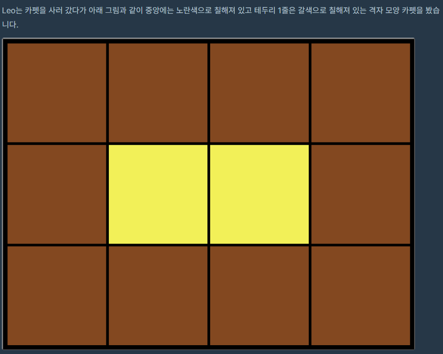 https://programmers.co.kr/learn/courses/30/lessons/42842 코딩테스트 연습 - 카펫 Leo는 카펫을 사러 갔다가 아래 그림과 같이 중앙에는 노란색으로 칠해져 있고 테두리 1줄은 갈색으로 칠해져 있는 격자 모양