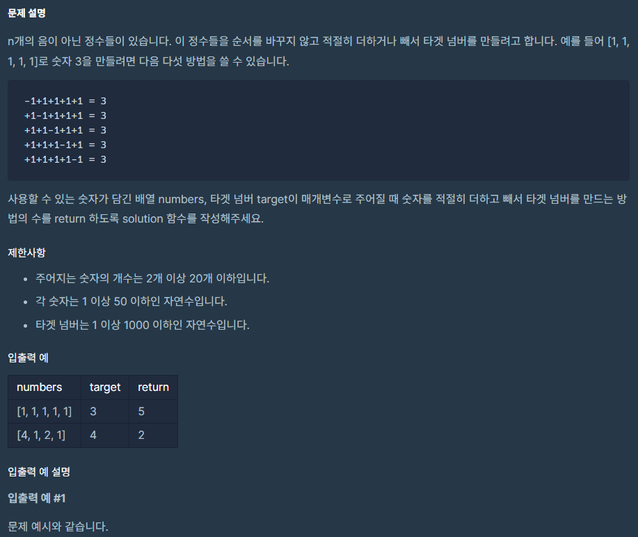 https://programmers.co.kr/learn/courses/30/lessons/43165 코딩테스트 연습 - 타겟 넘버 n개의 음이 아닌 정수가 있습니다. 이 수를 적절히 더하거나 빼서 타겟 넘버를 만들려고 합니다. 예를 들어 [1, 1, 1, 1, 1]로