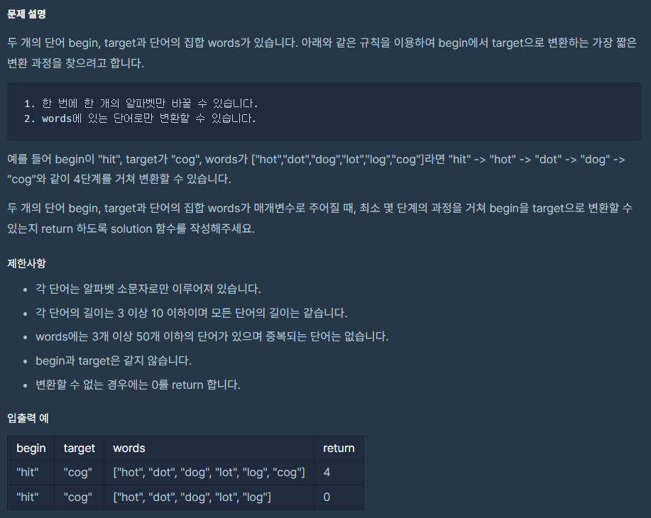 🔗 문제링크 https://programmers.co.kr/learn/courses/30/lessons/43163 👩🏻💻 코드 📝 정리 알고리즘을 보면 다음과 같다. 한 글자 빼고 나머지가 같은 단어를 words에서 찾는다. 찾은 단어를 visited