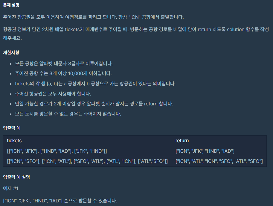 https://programmers.co.kr/learn/courses/30/lessons/43164?language=java주어진 항공권을 모두 이용하여 여행경로를 짜려고 합니다. 항상 "ICN" 공항에서 출발합니다.항공권 정보가 담긴 2차원 배열 ticke