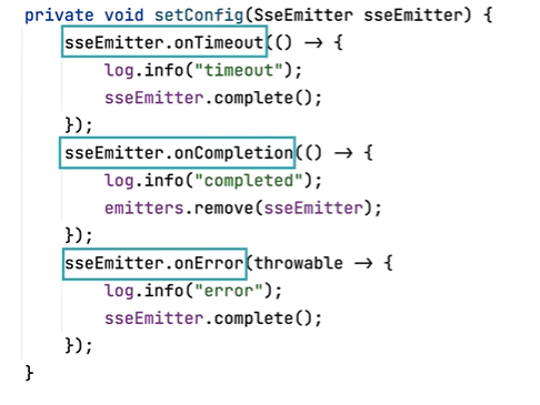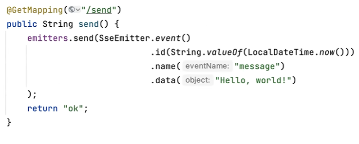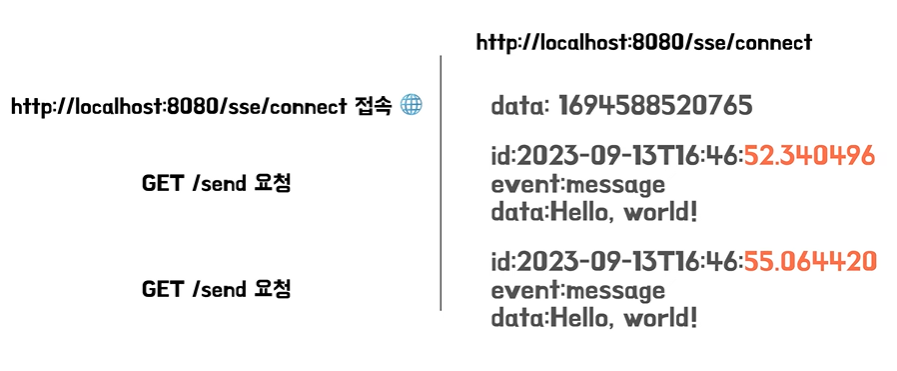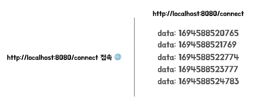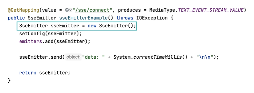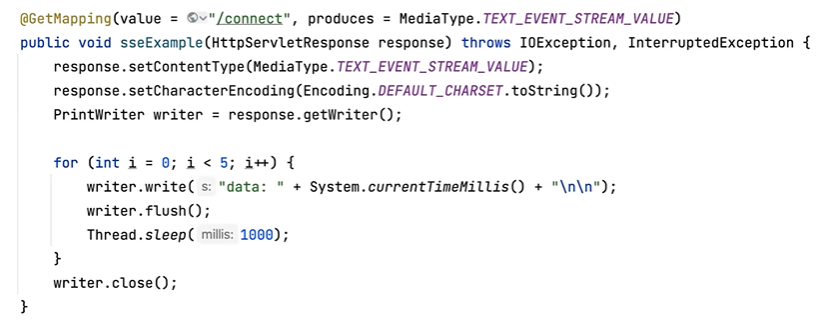 MediaType.TEXT_EVENT_STREAM_VALUE : 클라이언트는 SSE라는 걸 인식하게 되고, 한 번의 응답으로 연결을 끊지 않음